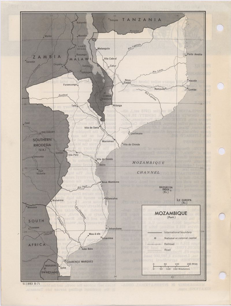 Mapa inserido na publicação: Mozambique : Background notes. - Washington : Department of State, Bureau of Public Affairs, Office of Public Communication, Editorial Division, 1973. - p. [2]. - (Department of state publication ; 7965)