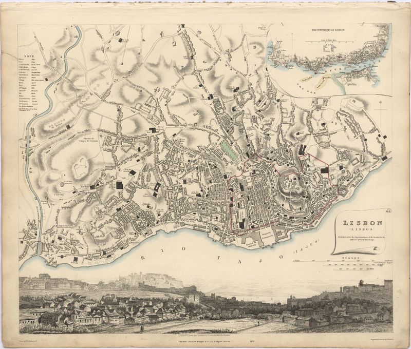 No canto sup. direito inclui um mapa: "The environs of Lisbon. Margem inferior inclui vista panorâmica de Lisboa "Lisbon from the Quinta da Torrinha Val de Pereiro".