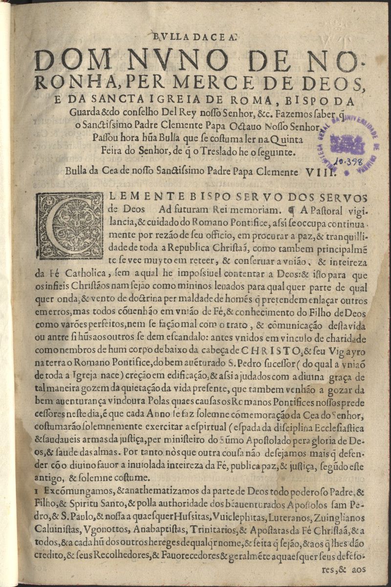 ... Bulla da Cea de nosso Sanctissimo Padre Papa Clemente VIII