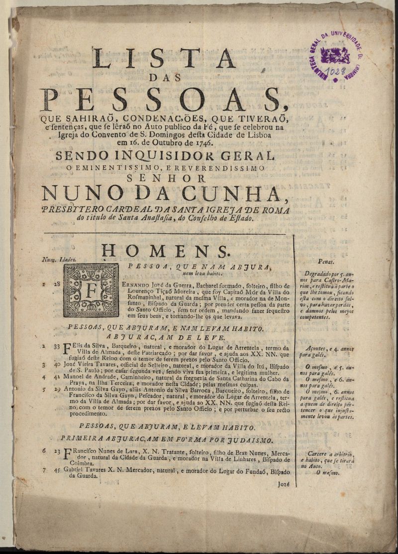 Lista das pessoas que sairam, condenações que tiveram e sentenças que se leram, no Auto público da Fé, que se celebrou na Igreja do convento de São Domingos desta cidade de Lisboa em 16 de Outubro de 1746..