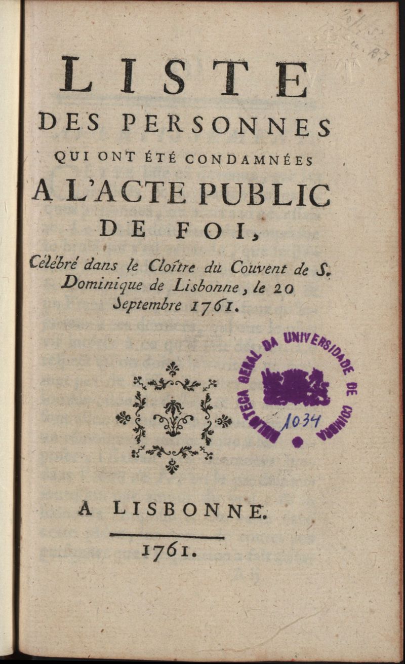 Liste des personnes qui ont été condamnées a l'acte public de foi, célébré dans la cloître du Couvent de S. Dominique de Lisbonne, le 20 Septembre 1761