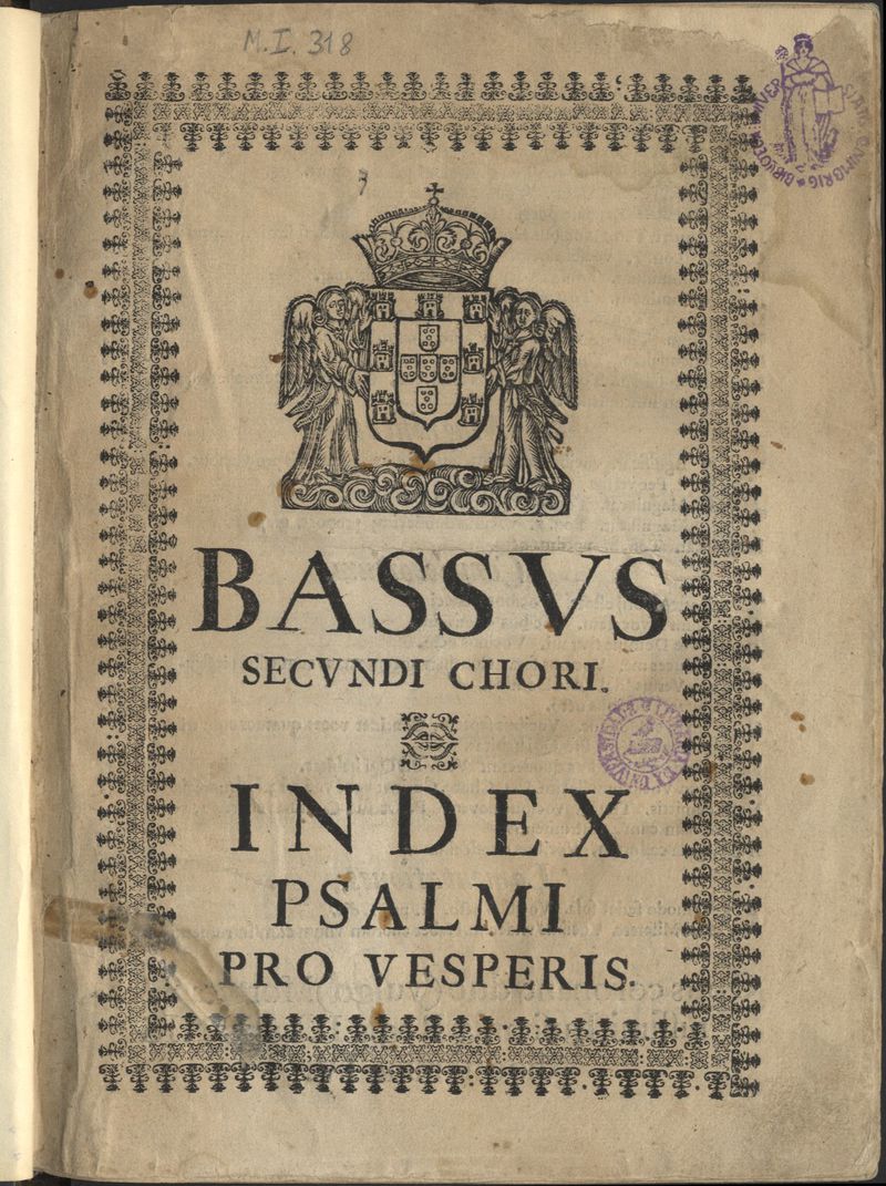Brasão de armas de Portugal ladeado por dois anjos na p. de tít., com orla tipográfica.