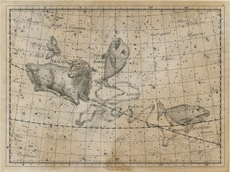 Contém estrelas de diversas constelações: Pisces, Aries et Musca, identificadas em: BODE, Johann Elert - Uranographia sive astrorum descriptio. Berolini, 1801.
