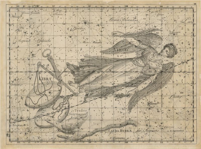 Contém estrelas de diversas constelações: Virgo, Libra, Turdus Solitarius, identificadas em: BODE, Johann Elert - Uranographia sive astrorum descriptio. Berolini, 1801.
