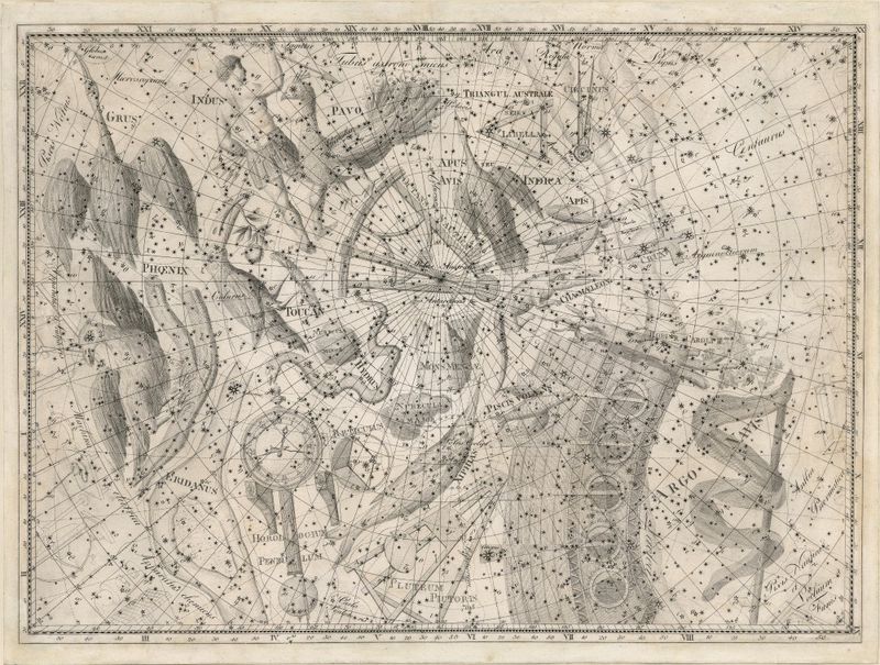 Contém estrelas de diversas constelações: Phoniz, Toucan, Nubecula minor, Hydrus, Horologium Pendulum, Reticulus, Nebecula major, Mons Mensae, Xiphias, Pluteum Pictoris, Piscis volans, Chamaeleon, Robur Caroli, Crux, Apis, Circinus, Triangulum australe seu Libella, Apus seu Avis Indica, Octans Nautica, Pavo, Indus, Grus, identificadas em: BODE, Johann Elert - Uranographia sive astrorum descriptio. Berolini, 1801.