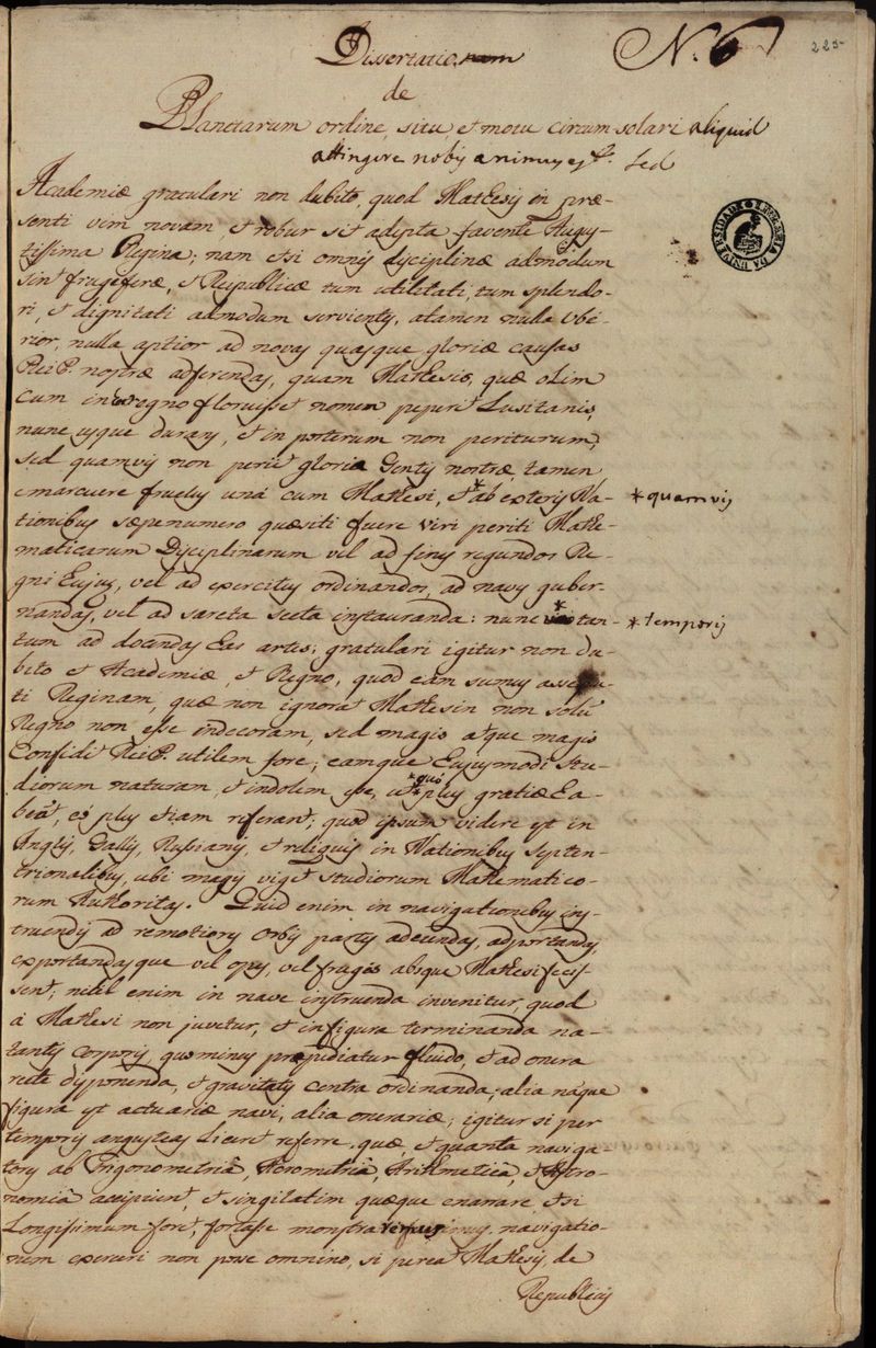 Dissertatio de Planetarum ordine, situ, et motu circum solari aliquid attingere nobis animus est