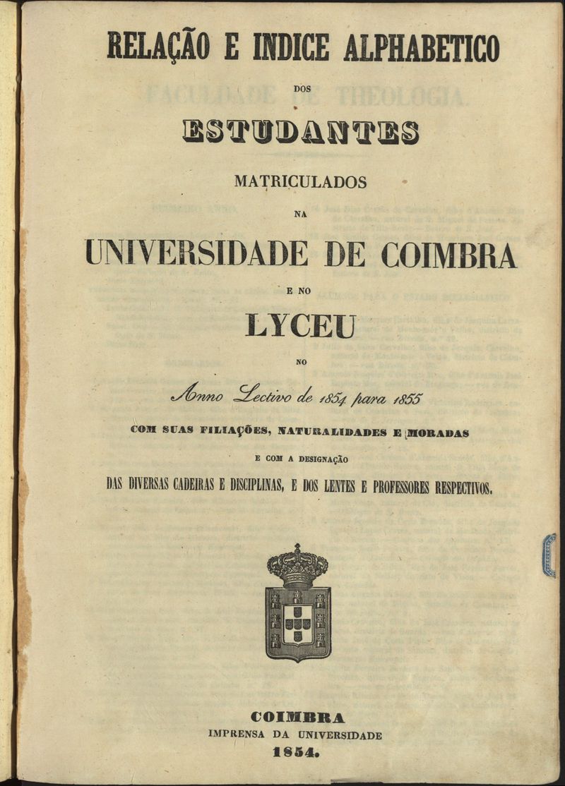 Relação e índice alfabético dos estudantes matriculados na Universidade de Coimbra e no Liceu