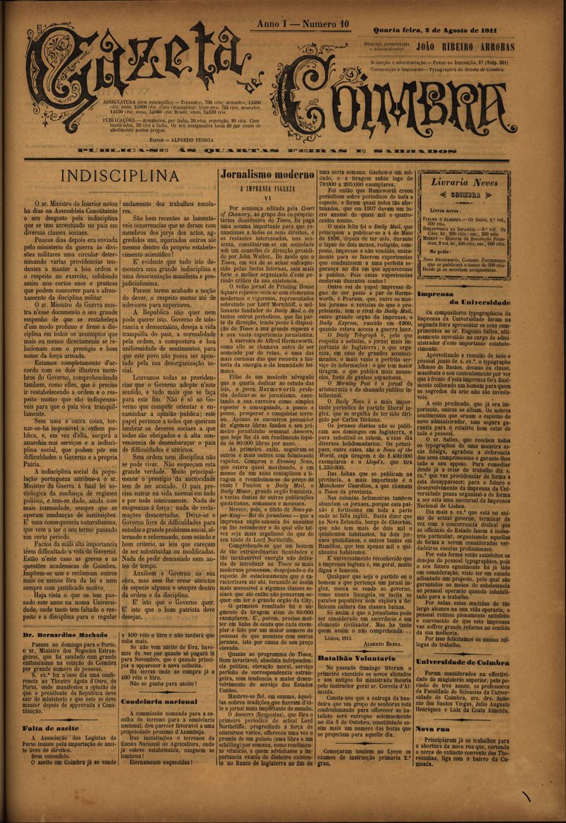 Gazeta de Coimbra 1911, Agosto 02, quarta-feira - Nº10
