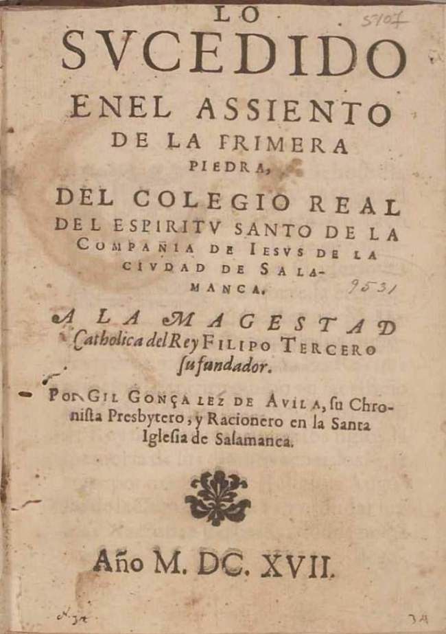 Lo sucedido en el assiento de la primera piedra, del Colegio Real del Espiritu Santo de la Companhia de Iesus de la ciudad de Salamanca ...
