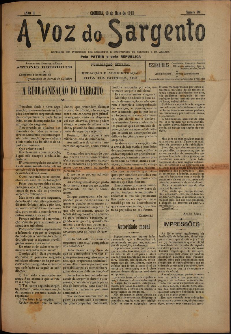 A voz do sargento : defensor dos interesses dos sargentos e equiparados do exército e armada - Nº68