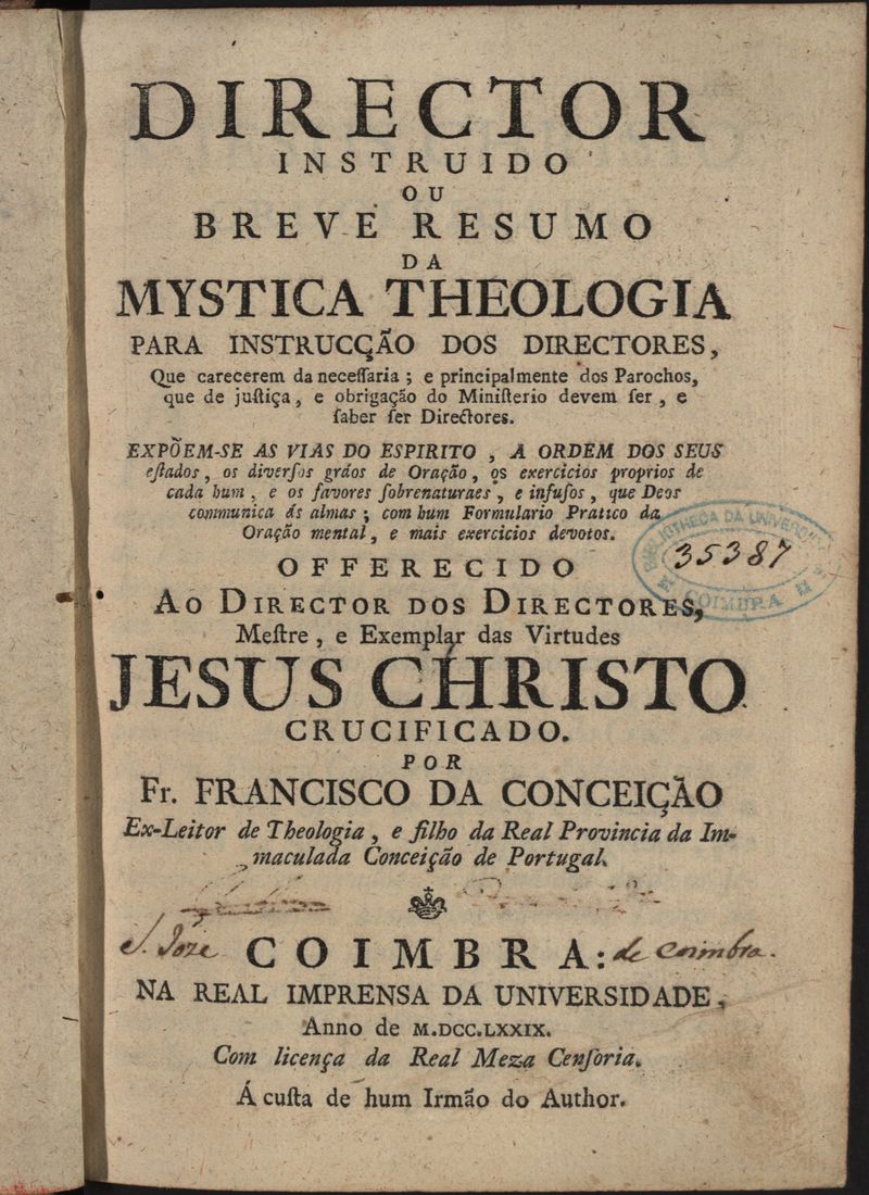 Aparado. - Manchas de acidez, humidade e picos de insectos. - Pert.: "S. Joze de Coimbra" ; outro pertence riscado. - Enc. em pele marmoreada, cansada, pasta superior mut. no canto superior direito, lombada mut. - Cota antiga 4-20-47a-9.