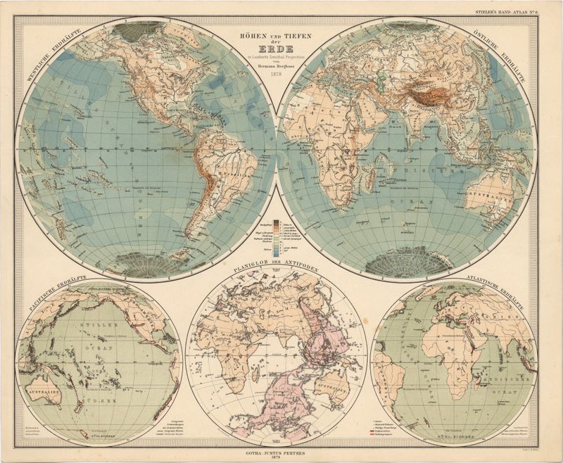 Höhen und Tiefen der Erde in Lambert's Zenithal Projection