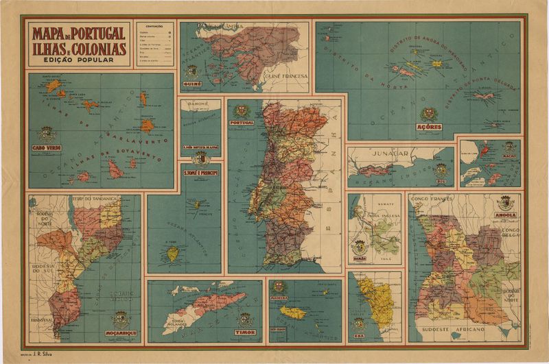 Contém insertos os seguintes mapas: Mapa 1: "Guiné" - Escala ca 1:2000000, determinada com o valor calculado 5,05 cm correspondente a "100 Km" . - Mapa 2: "Açores" - Escala ca 1:1900000, determinada com o valor calculado 3,15 cm correspondente a "60 Km" . - Mapa 3: "Cabo Verde" - Escala ca 1:1600000, determinada com o valor calculado 4,90 cm correspondente a "80 Km" . - Mapa 4: "S. João Baptista de Ajudá" - Escala não determinada . - Mapa 5: "Portugal" - Escala ca 1:2000000, determinada com o valor calculado 4,10 cm correspondente a "80 Km" . - Mapa 6: "Diu" - Escala ca 1:250000, determinada com o valor calculado 3,55 cm correspondente a "9000 m" . - Mapa 7: "Macau" - Escala ca 1:200000, determinada com o valor calculado 3,00 cm correspondente a "6000 m" . - Mapa 8: "Moçambique" - Escala ca 1:7700000, determinada com o valor calculado 3,90 cm correspondente a "300 Km" . - Mapa 9: "S. Tomé e Príncipe" - Escala ca 1:1900000, determinada com o valor calculado 2,10 cm correspondente a "40 Km" . - Mapa 10: "Damão" - Escala ca 1:570000, determinada com o valor calculado 3,50 cm correspondente a "20 Km" . - Mapa 11: "Angola" - Escala ca 1:7500000, determinada com o valor calculado 4,00 cm correspondente a "300 Km" . - 12: "Timor" - Escala ca 1:3100000, determinada com o valor calculado 4,90 cm correspondente a "150 Km" . - 13: "Madeira" - Escala ca 1:1100000, determinada com o valor calculado 2,70 cm correspondente a "30 Km . - 14: "Goa" - Escala ca 1:1200000, determinada com o valor calculado 2,60 cm correspondente a "30 Km".