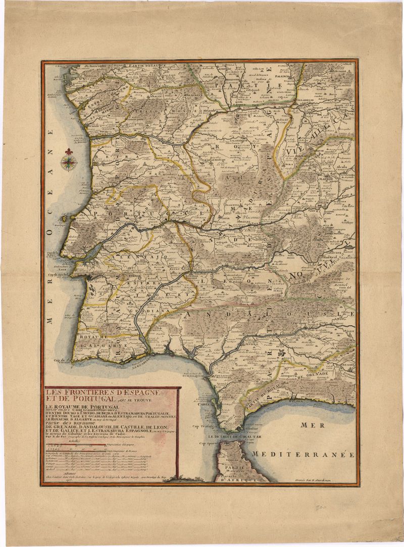 Les frontieres d'Espagne et de Portugal, ou se trouve le Royaume de Portugal divisé en ses cinq grandes provinces : d'entre Douro et Minho, de Beira, d'Estramadura Portugaise, et d'Entre Tage et Guadiana ditte Alentajo, et de Tralos Montes, le Royaume d'Algarve au roy de Portugal : partie des Royaumes de Grenade, d'Andalousie, de Castille, de Leon, et de Galice et Lestramadura Espagnole au roy d'Espagne : le detroit de Gibaltar et les environs de Cadiz