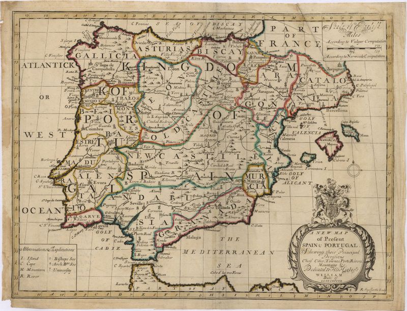 A new map of present Spain & Portugal : shewing their principal divisions, cheif cities, townes, rivers, mountains & c. : Dedicated to His Highness William Duke of Gloucester