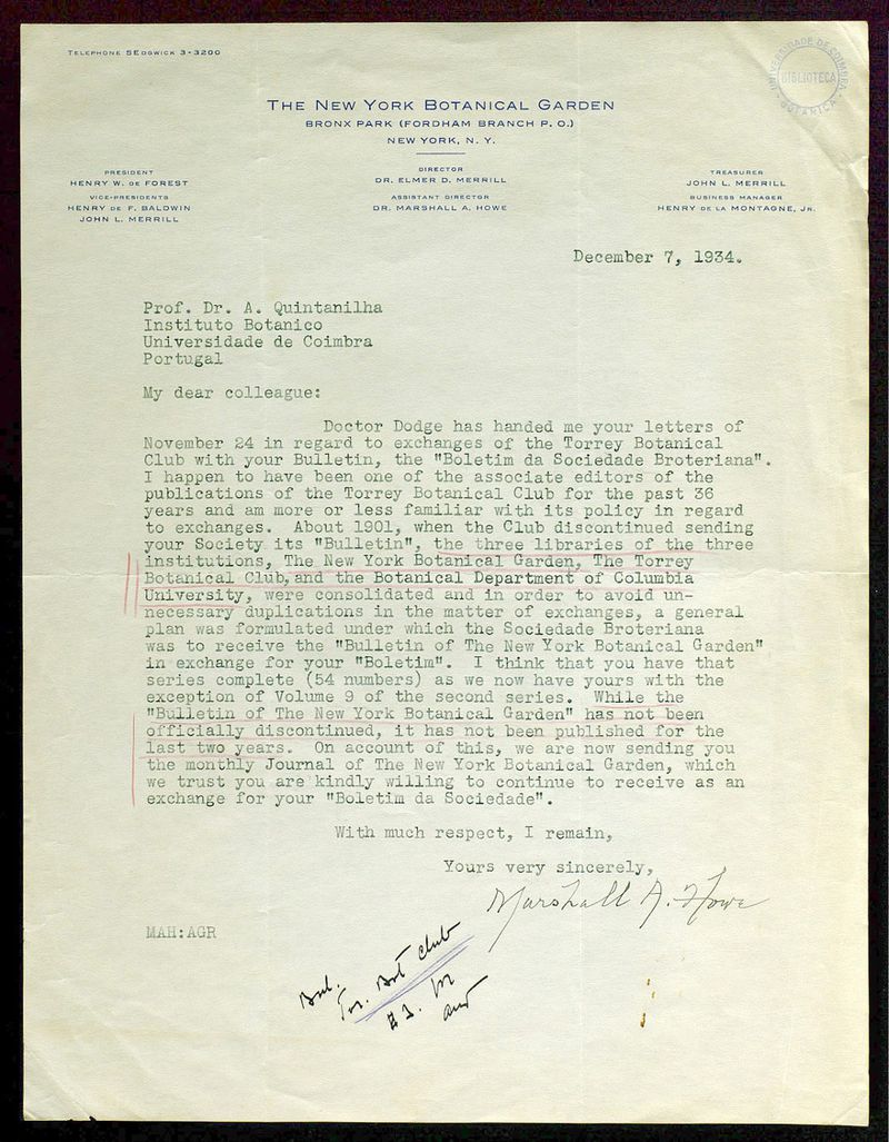 [Letter], 1934 Dec. 7, New York, [to] Prof. Dr. A. Quintanilha, Coimbra