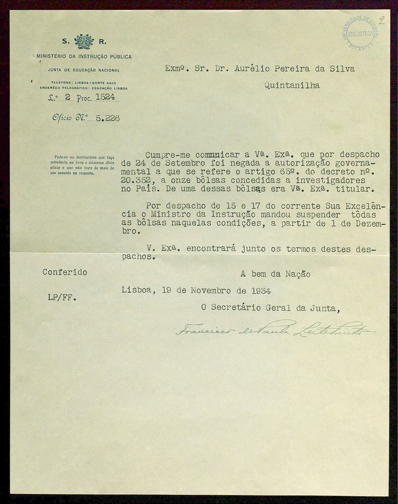 [Carta], 1934 Nov. 19, Lisboa, [a] Dr. Aurélio Pereira da Silva Quintanilha, [Coimbra]