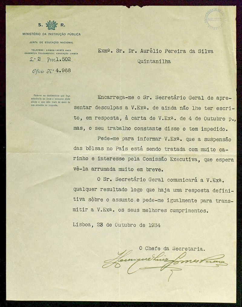 [Carta], 1934 Out. 23, [Lisboa], [a] Dr. Aurélio Pereira da Silva Quintanilha, [Coimbra]