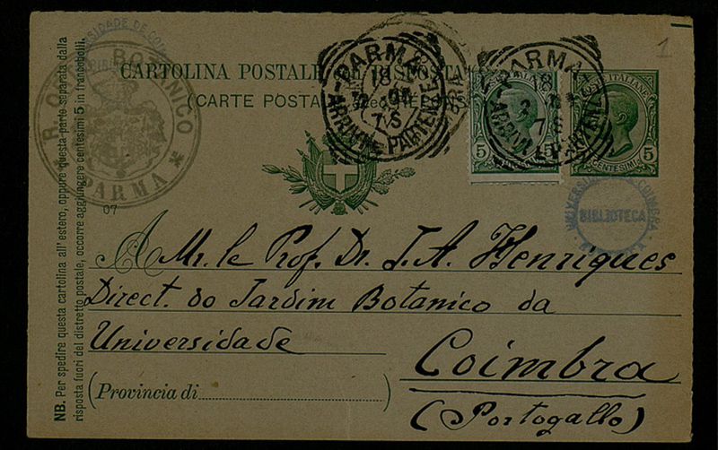 Cartolina Postale, 1908 fév. 18, Parma, [a] Mr. le Prof. Dr. J. A. Henriques, Coimbra