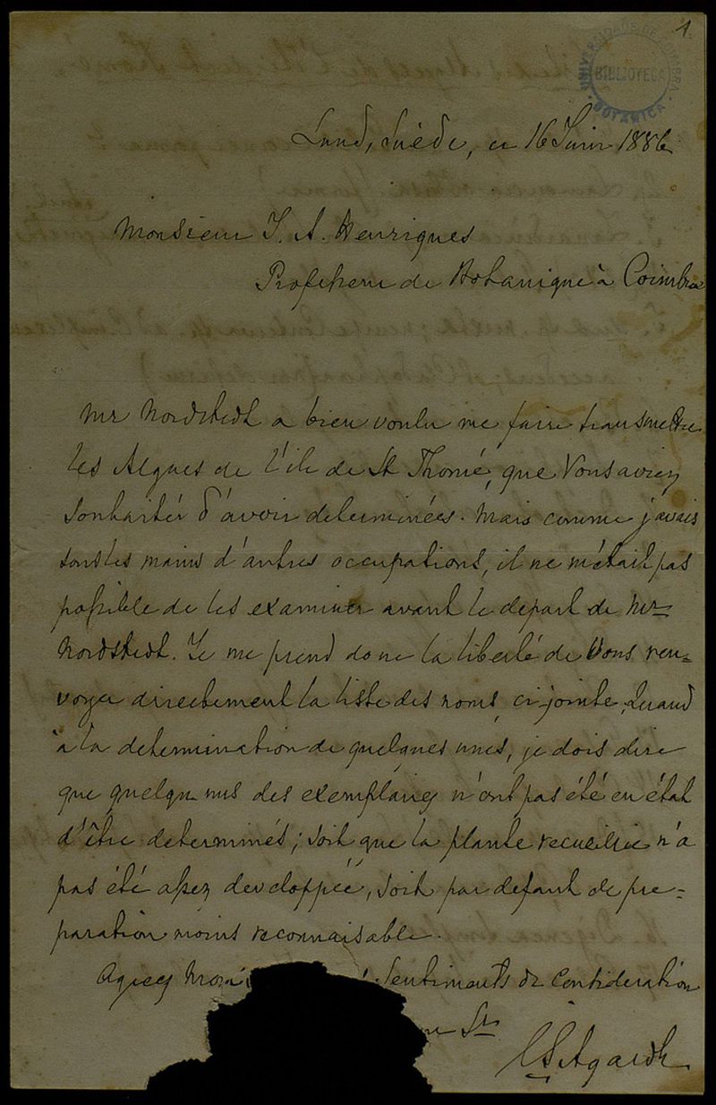 [Lettre], 1886 juin 16, Lund, [à] J. A. Henriques, Coimbra