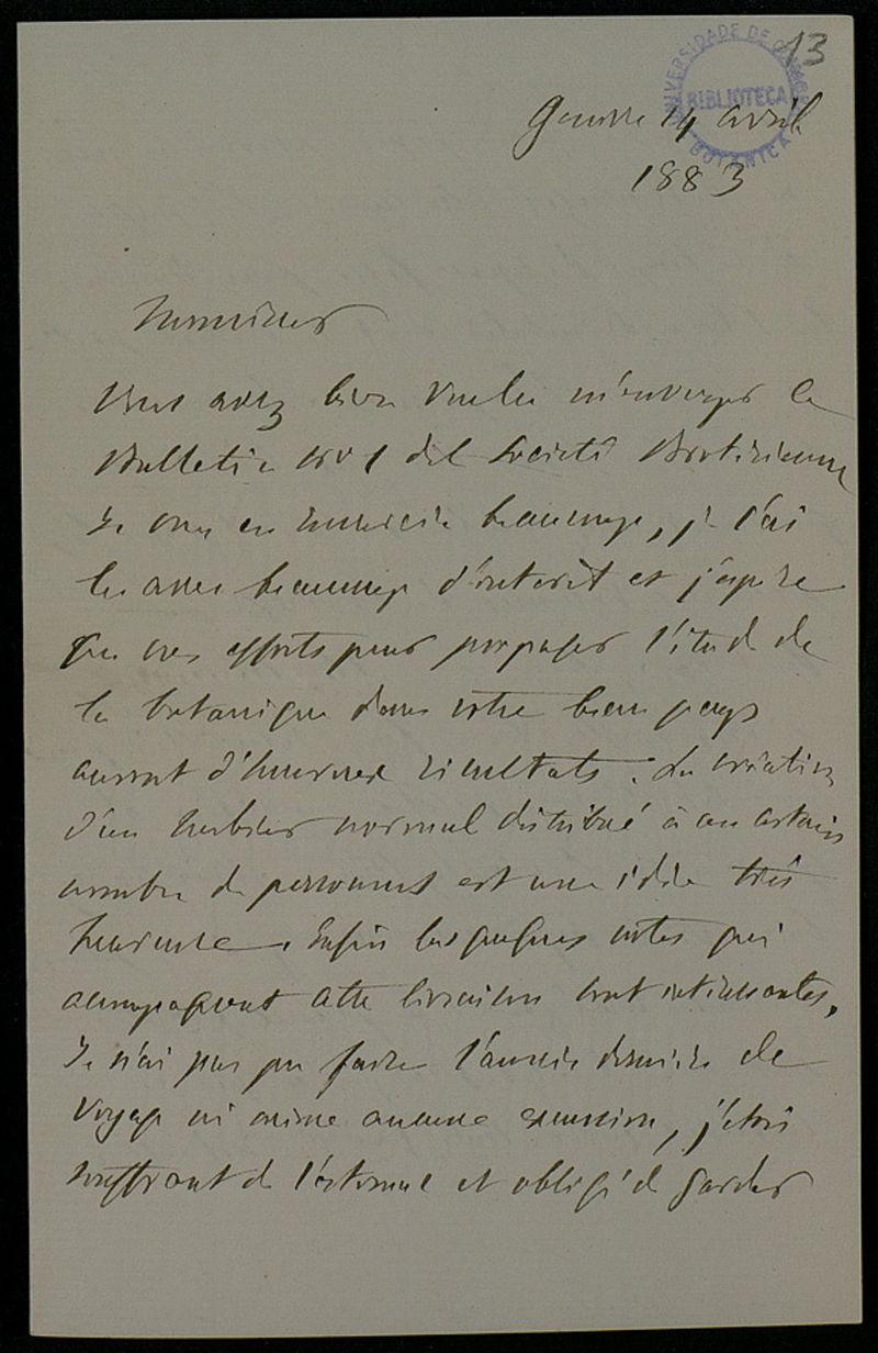 [Lettre], 1883 avr. 14, Genève, [à] Monsieur [Júlio Henriques, Coimbra]
