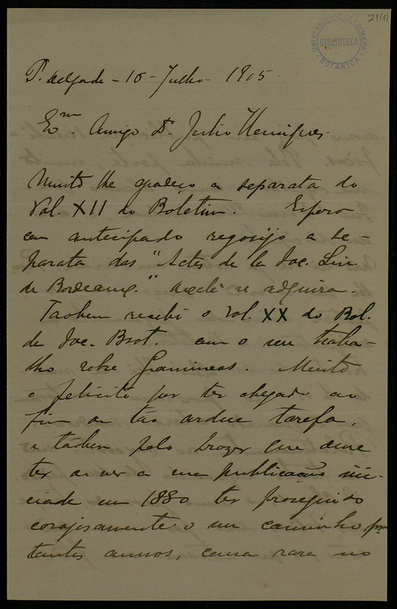 [Carta], 1905 Jul. 16, Ponta Delgada, a Dr. Júlio Henriques, [Coimbra]