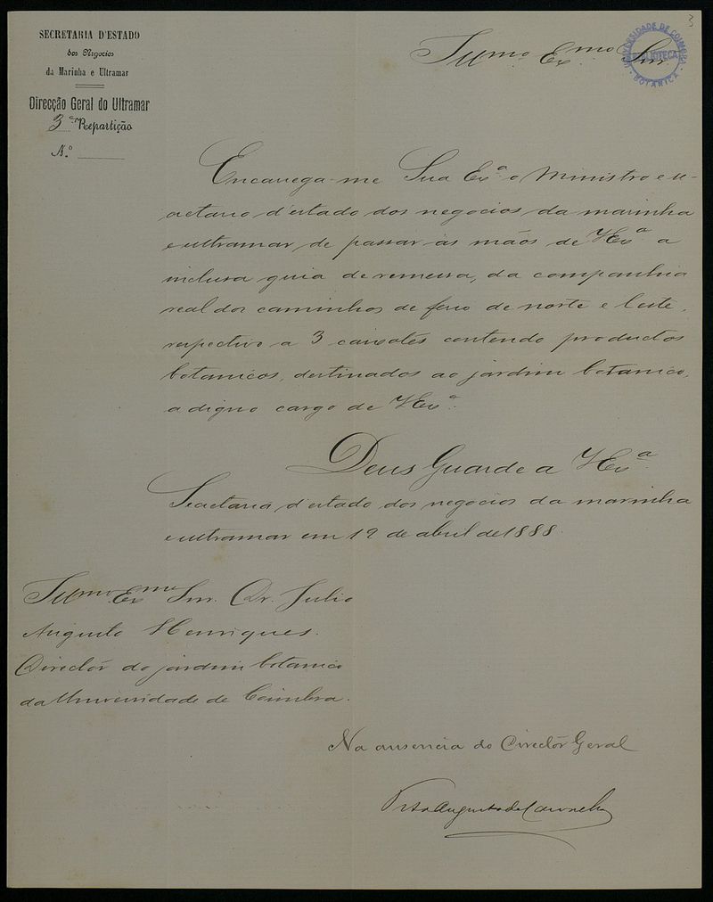 [Carta], 1888 Abr. 19, [Lisboa], a Dr. Júlio Augusto Henriques, Coimbra