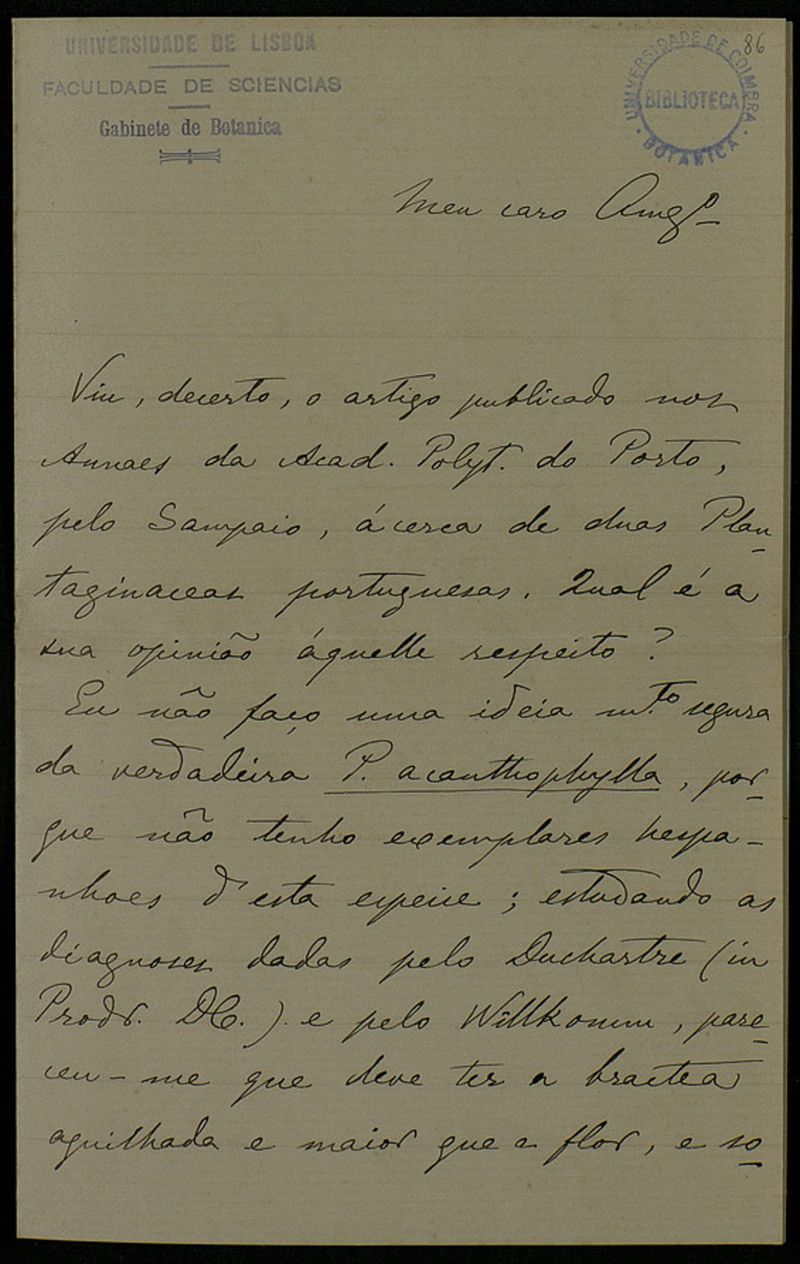 Papel timbrado de: Universidade de Lisboa - Faculdade de Sciencias - Gabinete de Botanica.