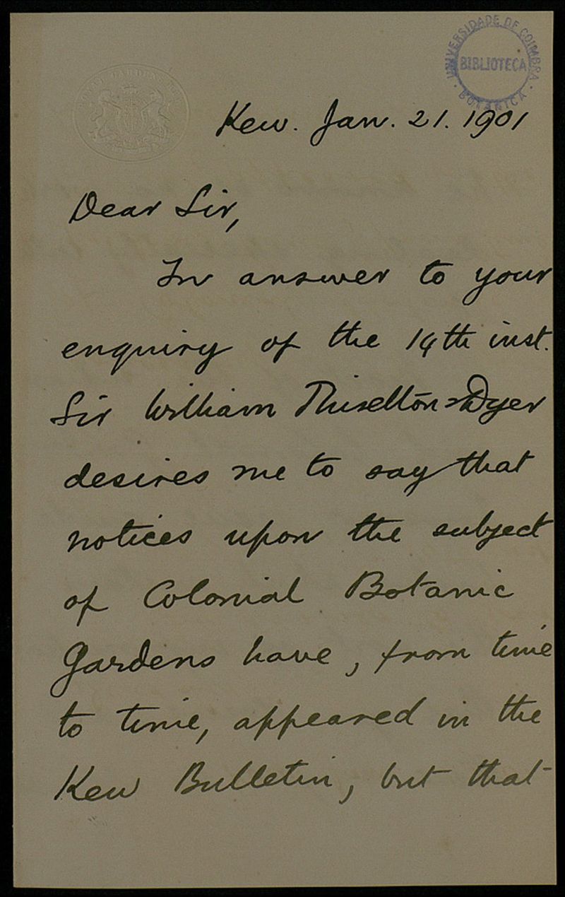 [Letter], 1901 Jan. 21, Kew, [to] M. le Prof. [Júlio] Henriques, Coimbra