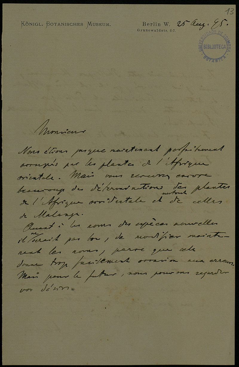 [Lettre], 1895 août 25, Berlin, [à Júlio Henriques], Coimbra