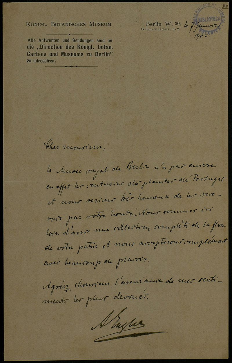 [Lettre], 1902 jan. 7, Berlin, [à Júlio Henriques], Coimbra