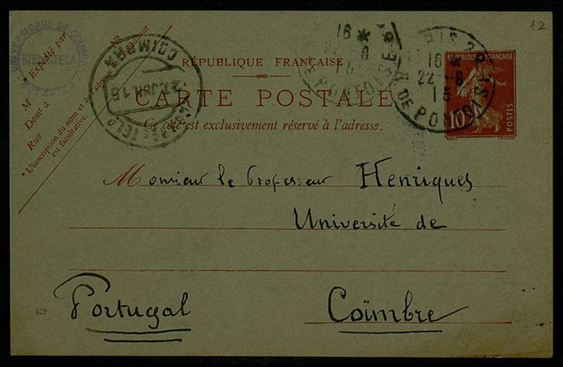 Carte postale, 1915 juin 21, Paris, [à] Monsieur le Professeur [Júlio] Henriquez, Coimbra