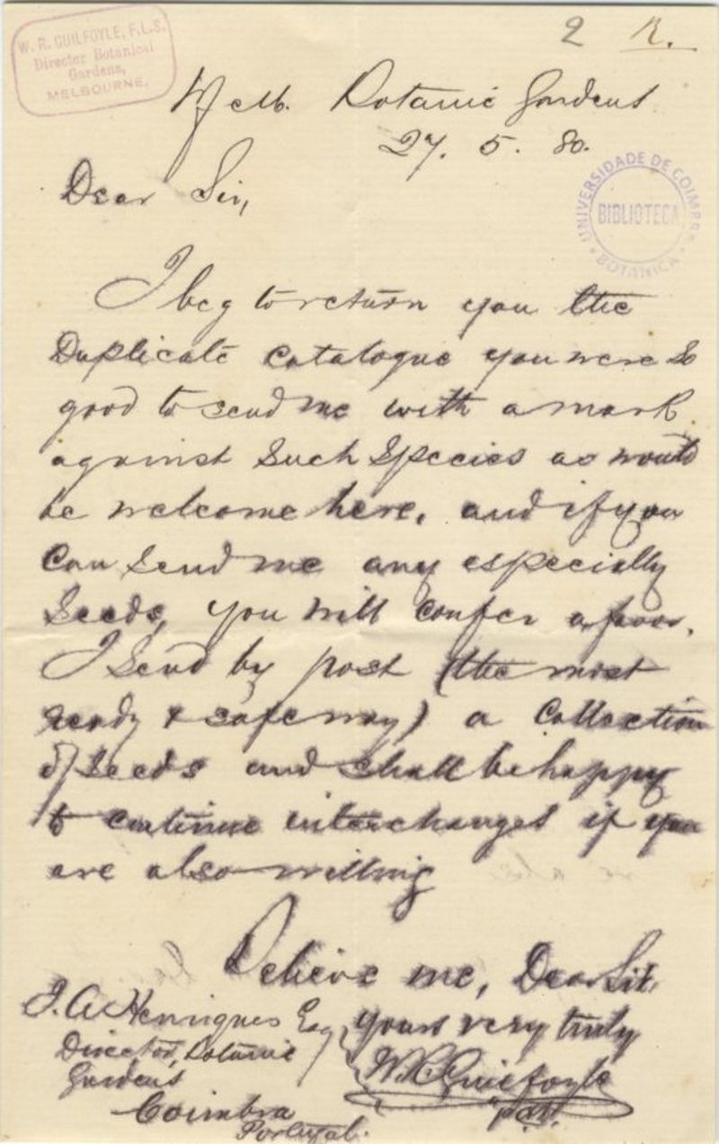 [Letter], 1880 May 27, Melb. Botanic Gardens [to] J[úlio] A[ugusto] Henriques, Coimbra