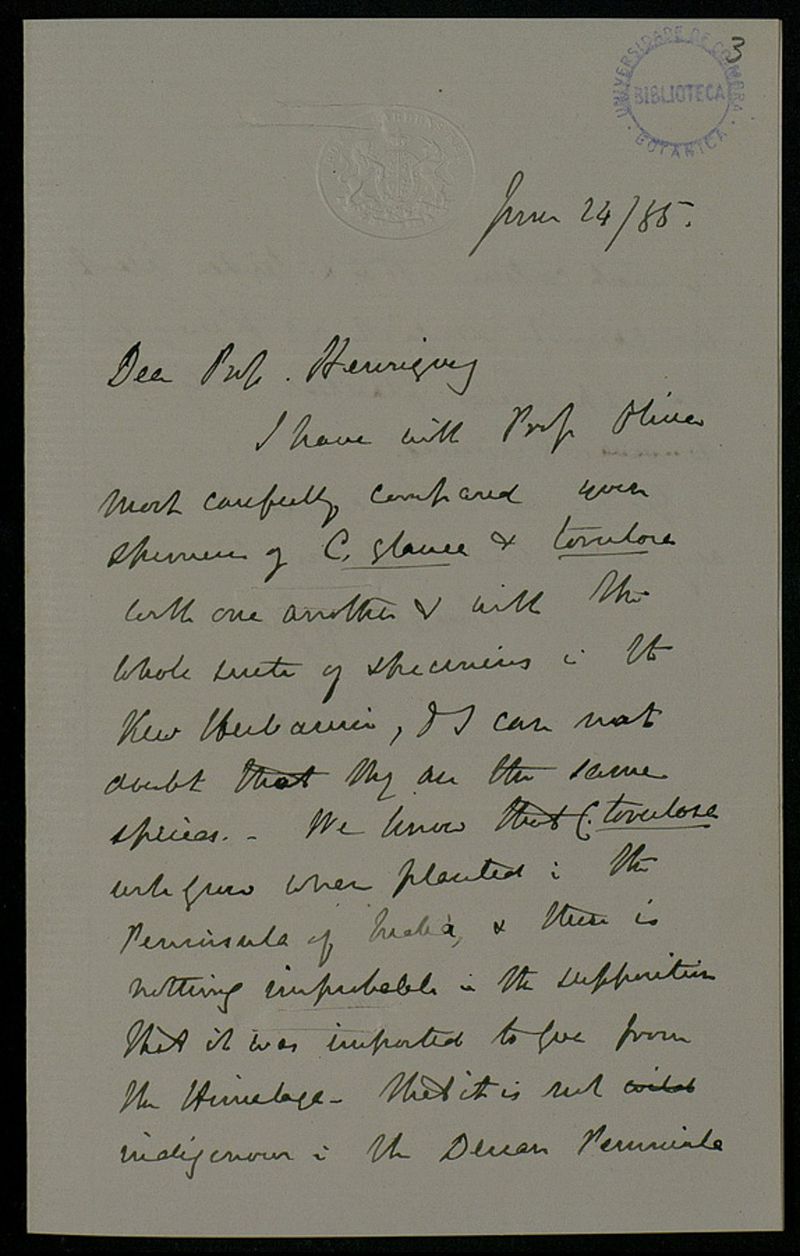 [Letter], 1885 June 24, Kew, [to ] Prof. [Júlio] Henriques, Coimbra
