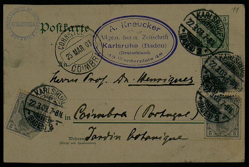 Postkarte, 1903 März 22, Karlsruhe, an Herrn Prof. Dr. [Júlio] Henriques, Coimbra
