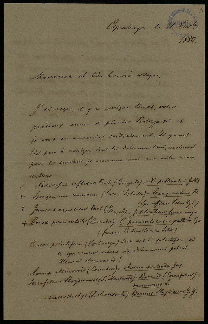[Lettre], 1880 nov. 11, Copenhague, [à] Monsieur [Júlio Henriques], Coimbra