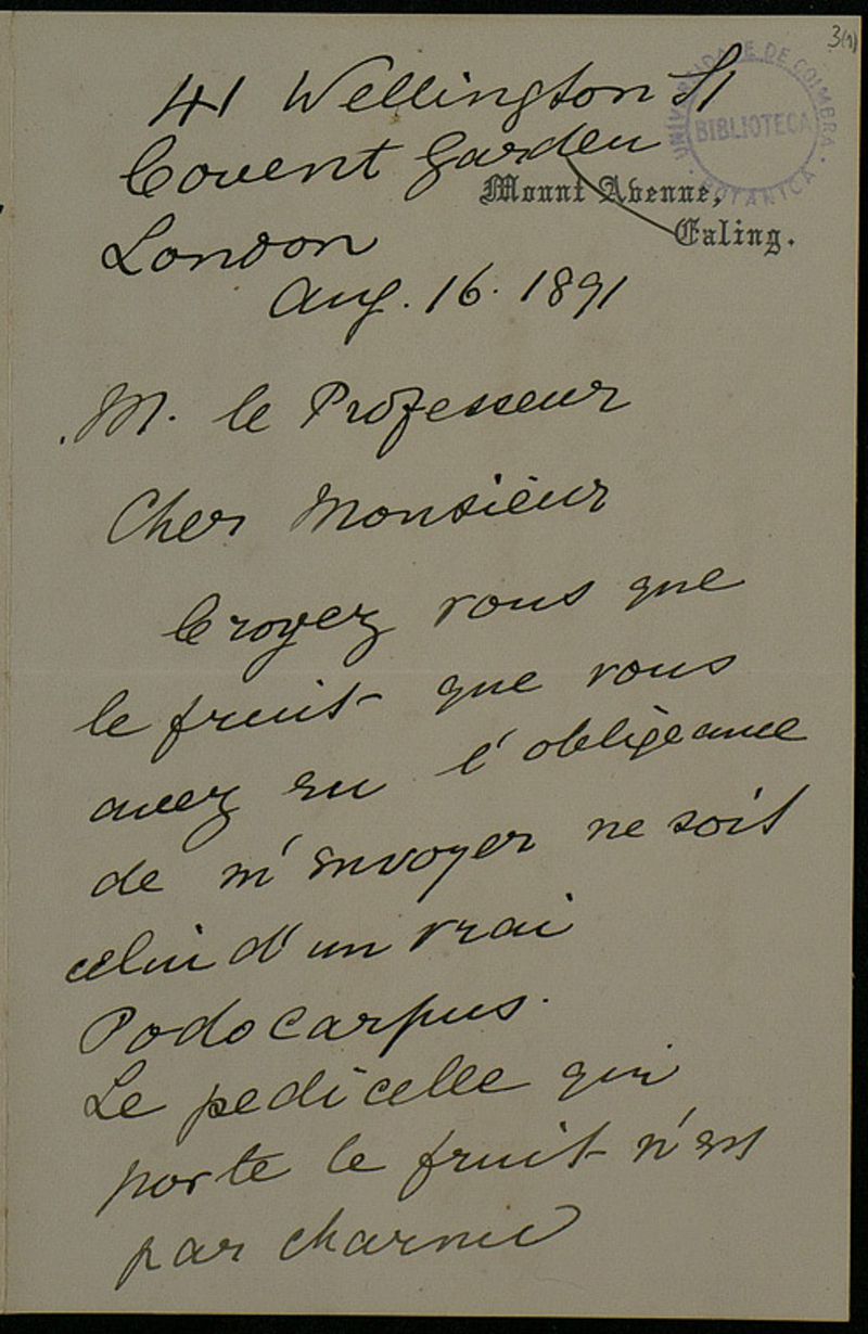 [Lettre], 1891 Aug. 16, London, [to Júlio Henriques, Coimbra]