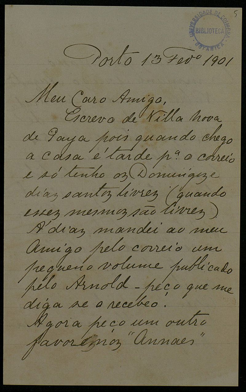 [Carta], 1901 Fev. 13, Porto, [a Júlio Henriques], Coimbra