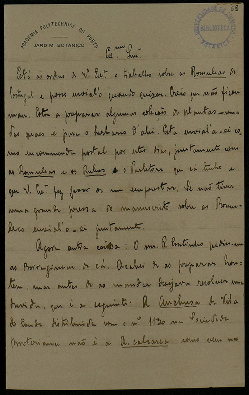 Papel timbrado de: Academia Polythechnica do Porto - Jardim Botanico.