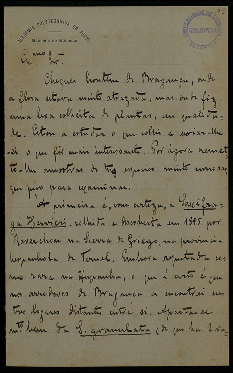Papel timbrado de: Academia Polythechnica do Porto - Gabinete de Botanica.