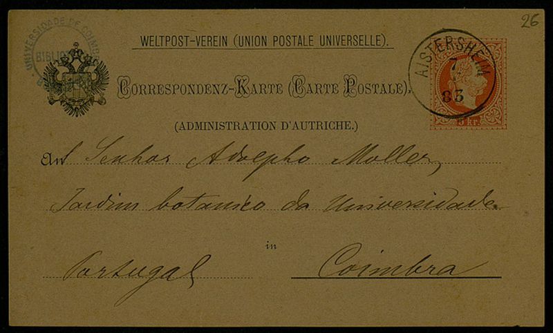 Correspondenz-Karte, 1883 März 7, Aistersheim, an Senhor Adolpho Moller, Coimbra