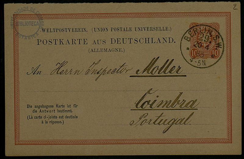 Postkarte, 1885 Apr. 20, Berlin, an Herrn [Adolpho F.] Moller, Coimbra