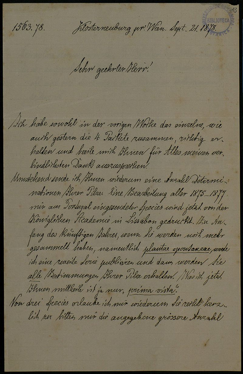 [Brief], 1878 Sept. 21, Klosterneuburg, [an] Herr[n Adolfo F. Möller, Coimbra]