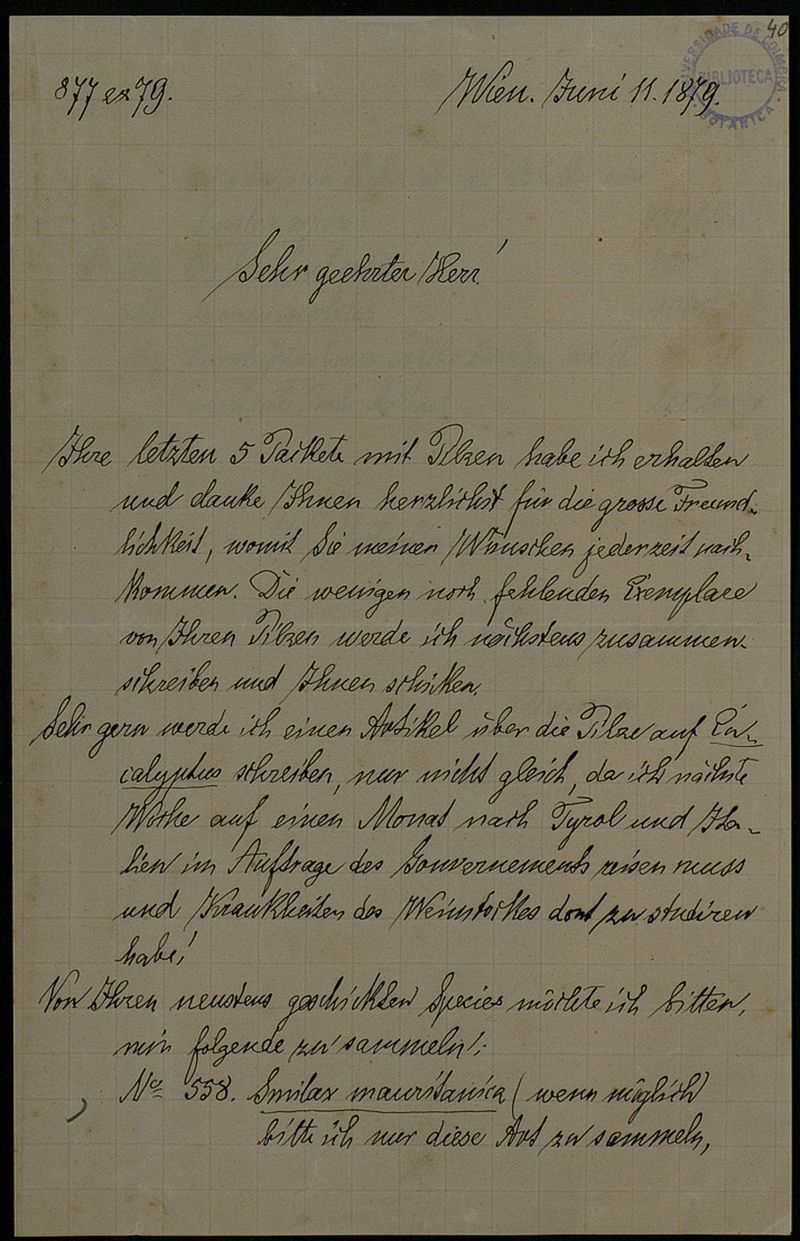 [Brief], 1879 Juni 11, Wien, [an] Herr[n Adolfo F. Möller, Coimbra]