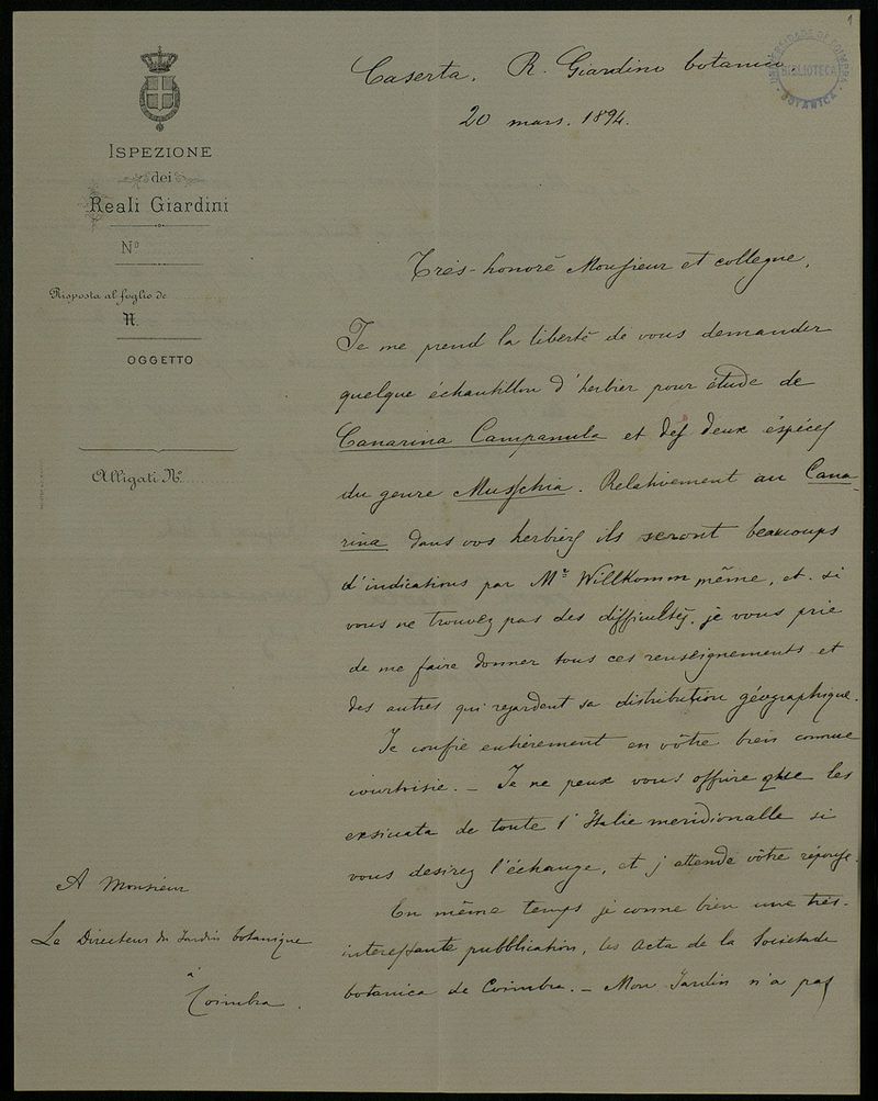 [Letter], 1894 mars 20, Caserta, à [Júlio Henriques], Coimbra