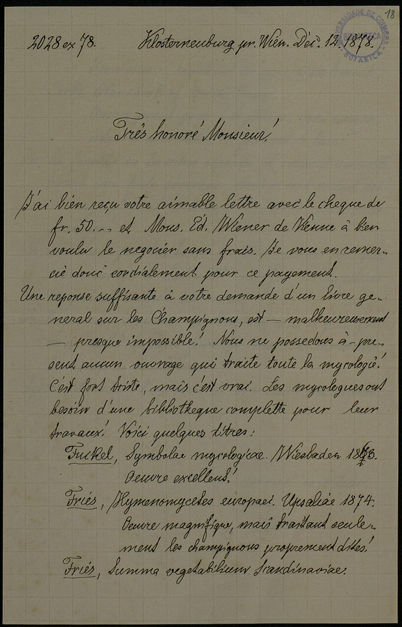 [Lettre], 1878 déc. 12, Klosterneuburg, [à] Monsieur [Júlio Henriques, Coimbra]