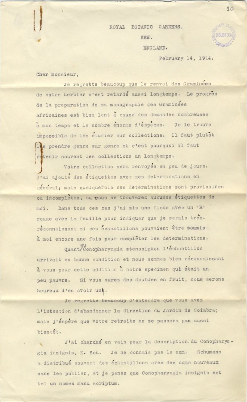 [Lettre], 1914 fév. 14, Royal Gardens, Kew, [Londres], [à] J.[úlio] A. Henriques, Coimbra