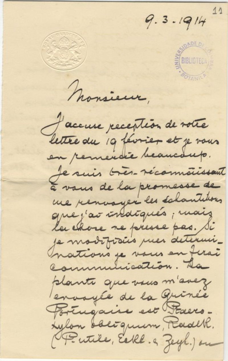 [Lettre], 1914 mars 09, [Royal Gardens, Kew, Londres], [à Júlio Henriques, Coimbra]