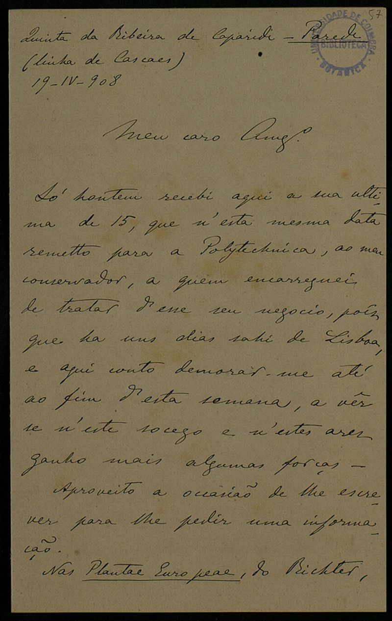 [Carta], 1908 Abr. 19, Ribeira de Caparide, [a Júlio Henriques, Coimbra]