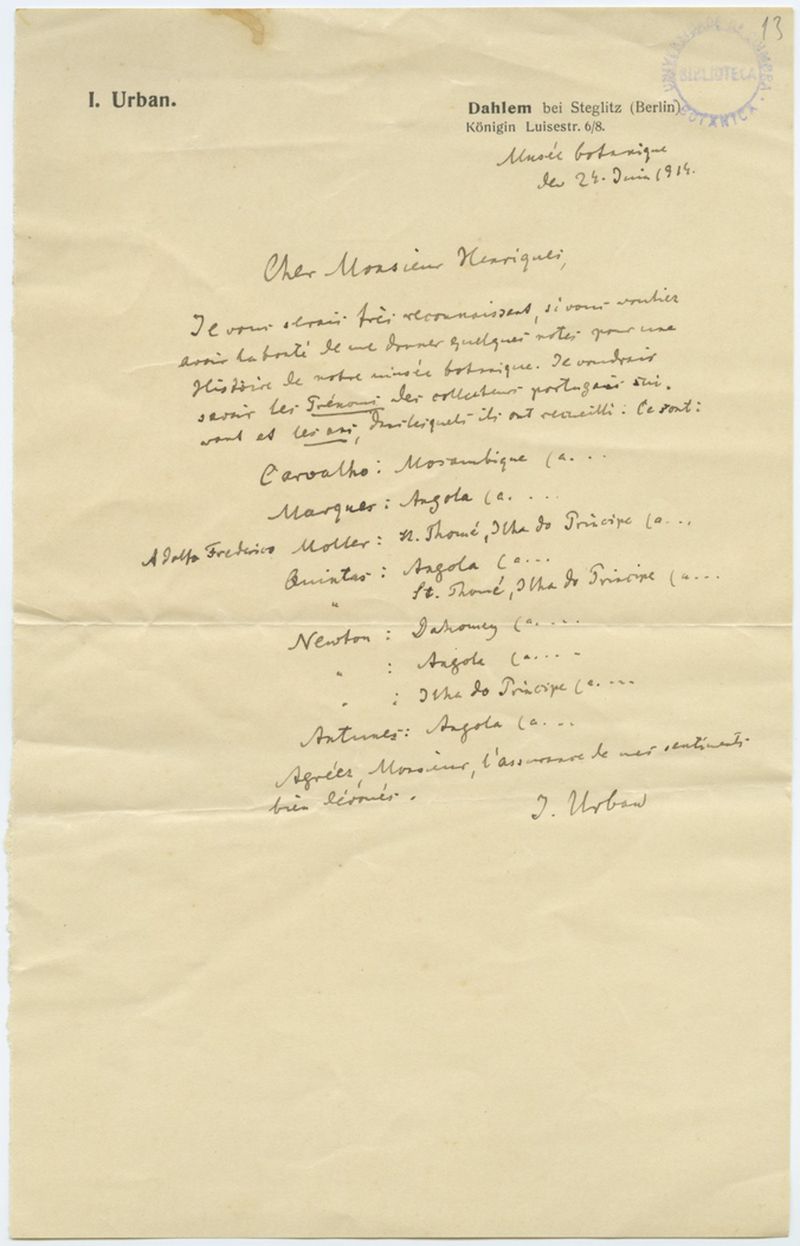 [Lettre], 1914 juin 24, Dahlem, à Monsieur [Júlio] Henriques, Coimbra